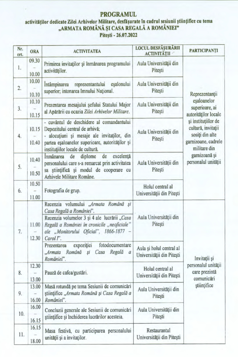 Personalul Arhivelor Militare Naționale Române și invitații din garnizoana București, se vor deplasa către garnizoana Pitești în data de 26 iulie 2022, cu un autocar