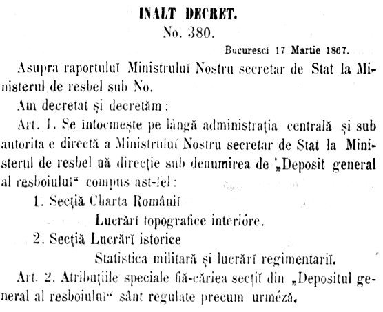 La 17 martie 1867, prin Înaltul Decret nr. 380, a fost înființat Depozitul General al Războiului, ca direcţie independentă în cadrul Administraţiei Centrale a Ministerului de Război. Depozitul General al Războiului era format din Secţia I Harta României. Lucrări topografice interioare şi Secţia a II-a Lucrări istorice. Statistica militară şi lucrări regimentare.