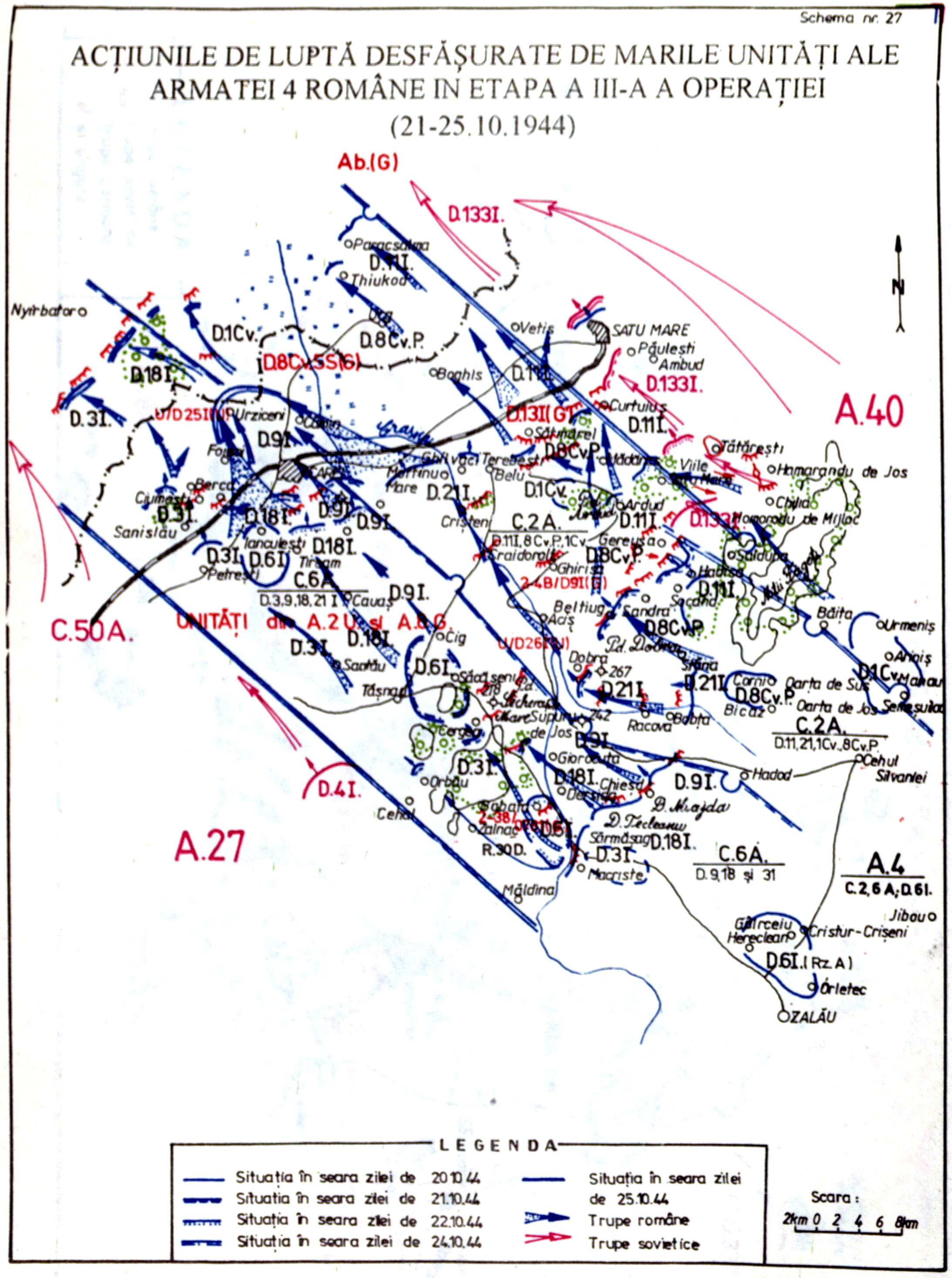 Harta acțiunilor de luptă ale Armatei a 4-a pentru eliberarea ultimelor brazde ale teritoriului românesc anexat de Ungaria, cu sprijnul Germanie naziste și Italiei fasciste, prin Dictatul de la Viena din 30 augsut 1940 | Monumentul eroilor români căzuți în lupta pentru eliberarea Ardealului de Nord, ridicat în orașul Carei în anul 1964 |