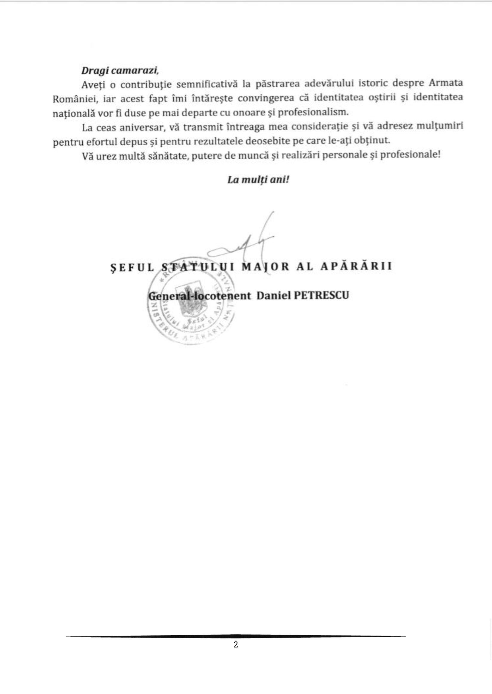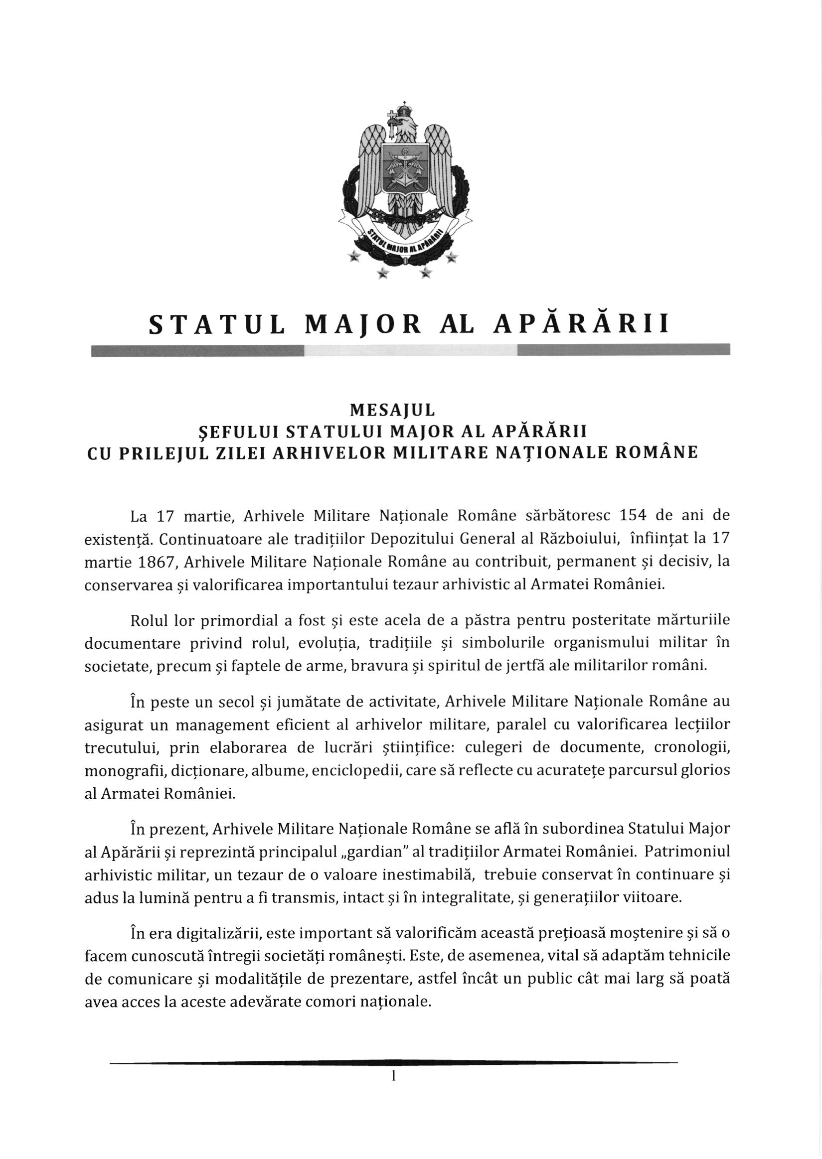 Vă prezentăm în continuare mesajul șefului Statului Major al Apărării cu ocazia Zilei Arhivelor Militare Naționale